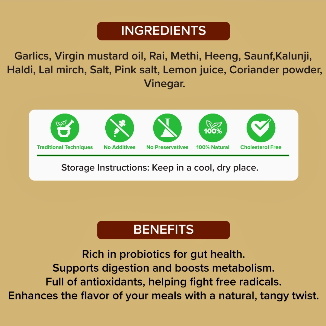 Key Ingredients: Fresh garlic cloves, virgin mustard oil, traditional spices.